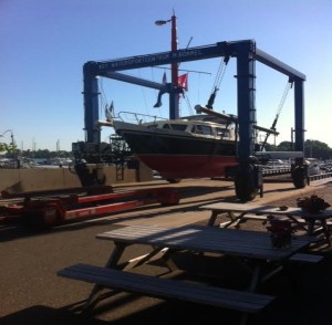 Am Hafen gibt es einen Bootsaufzug mit einer Kapazität von 40 Tonnen. Nach Terminabsprache können wir Ihr Boot ein- oder ausfahren, abspritzen, aufbocken oder auf Ihren Anhänger stellen.